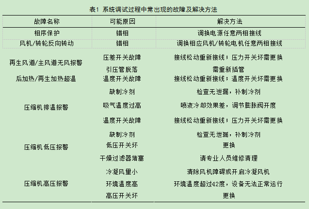 為了確保調(diào)試過程中人身設(shè)備安全,在除濕機(jī)調(diào)試前(斷電情況下)應(yīng)先確保各電器元件安裝型號(hào)正確。然后,檢查電氣接線,確保接線端子全部緊固,確定線路接線正確,其絕緣性能,系統(tǒng)接地均符合要求。