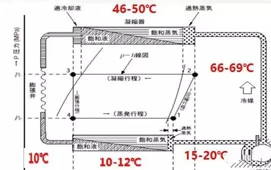 按照經(jīng)驗(yàn),系統(tǒng)的冷凝溫度=環(huán)境溫度+(10~15℃);我們以夏天環(huán)境溫度35℃空調(diào)為例子。