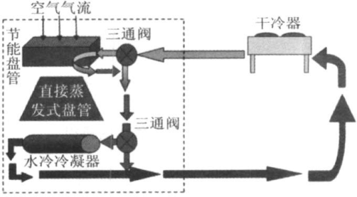 同水冷機房空調(diào)機組一樣,乙二醇自然冷卻機房空調(diào)機組也可以解決風(fēng)冷機組室內(nèi)外機高差和當(dāng)量銅管長度的限制,而且在北方地區(qū),乙二醇也不會因為天氣寒冷而凍結(jié),冷凝器全年的冷卻效果都非常好。而且在室外溫度低于 2 ℃時 ,可關(guān)閉壓縮機, 啟用系統(tǒng)中的自然冷卻盤管來提供機房所需的全部冷量;當(dāng)室外溫度在 2~18 ℃之間時 ,系統(tǒng)中的自然冷卻盤管可提供部分冷量,以減少壓縮機的負荷。圖 2 是乙二醇自然冷卻機房空調(diào)的示意圖。