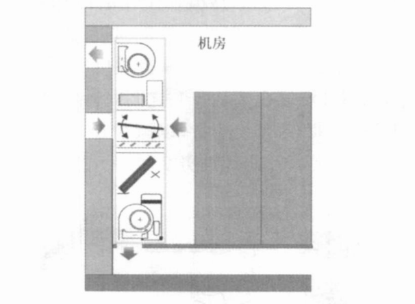 機房內(nèi)部由于集中布置了大量的散熱設(shè)備 ,導(dǎo)致機房即使冬天也需要制冷 ,而冬季室外空氣溫度比較低,可將新風(fēng)經(jīng)過處理后引入室內(nèi)側(cè) ,以縮短壓縮機工作時間 ,提高機房空調(diào)運行的經(jīng)濟性。圖 4 是一體式自由新風(fēng)機房空調(diào)機組的安裝示意圖。圖中機房空調(diào)機組中間部位的風(fēng)閥可自由擺動 ,從而可使機房空調(diào)機組在蒸氣壓縮循環(huán)制冷和室外新風(fēng)制冷的不同功能間自由切換。