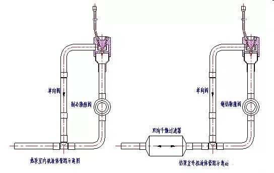 圖示翅片盤管作冷凝器使用時,冷凝液體直接通過單向閥,不通過圖中毛細管;作蒸發(fā)器用時,制冷劑經過主毛細管一次節(jié)流后,再由分流毛細管分流。