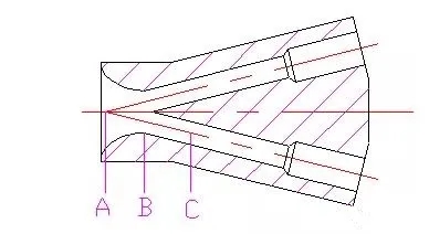 文丘里管型分流頭結構十分簡單,只有本體,不帶其它零部件,但加工困難。從熱力膨脹閥出口的制冷劑兩相混合物,由分流頭進口A流經收縮口B時,雖流速較高,壓力降較大,但流線平順,不與管壁脫離,使氣液兩相流體均勻地進入圓環(huán)形流道C中,由于管內收縮與擴張段采用平滑過渡,制冷劑在整個流動過程中不產生紊流,所以文丘里管型分流頭阻力較小,對安裝位置無特殊要求。