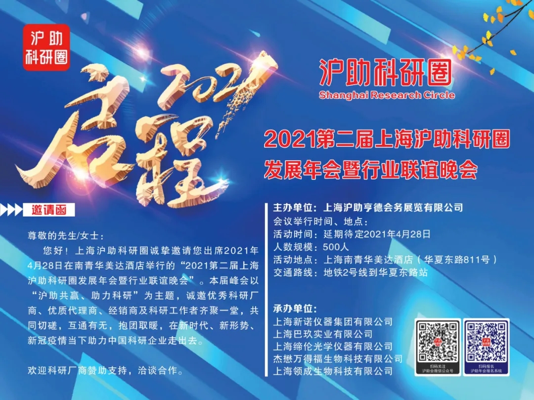 2021第二屆上海滬助科研圈發(fā)展年會暨行業(yè)聯(lián)誼晚會定于2021年4月28日在上海南青華美達(dá)酒店舉行。本屆峰會以“滬助共贏、助力科研”為主題,邀請了優(yōu)秀的科研廠商、優(yōu)質(zhì)代理商、經(jīng)銷商及科研工作者齊聚一堂,共同切磋,互通有無,在新時代、新形勢、疫情當(dāng)下助力中國科研企業(yè)走出去...