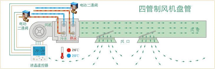 四管制空調(diào)指空調(diào)箱同時(shí)裝有冷盤管和熱盤管,每組盤管一進(jìn)一回,共四根,所以叫四管制。兩組水管分別接入冷水和熱水,也就是一年四季不管什么時(shí)候,制冷制熱都可以隨時(shí)切換,可以實(shí)現(xiàn)一些房間供熱的同時(shí),另一些房間供冷。并且配合末端設(shè)備能夠?qū)崿F(xiàn)室內(nèi)溫度和濕度精確控制的要求;由于冷水和熱水在管路和末端設(shè)備中完全分離,有助于系統(tǒng)的穩(wěn)定運(yùn)行和減小設(shè)備的腐蝕;所以它的標(biāo)準(zhǔn)高,成本也高。所以全年運(yùn)行過(guò)程中,供冷和供熱工況頻繁交替轉(zhuǎn)換或需同時(shí)使用的空氣調(diào)節(jié)系統(tǒng),宜采用四管制水系統(tǒng)。它較適合于內(nèi)區(qū)較大,或建筑空調(diào)使用標(biāo)準(zhǔn)較高且投資允許的建筑中。