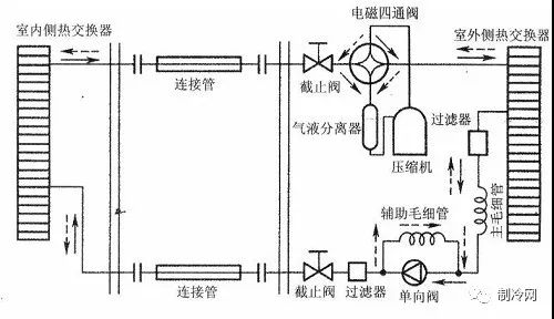 3、熱泵系統(tǒng) 。與單冷系統(tǒng)情況相同,熱泵運(yùn)行是否正常,主要檢查四通換向閥的工作情況。換向閥換向時(shí),可聽到有比較響的氣體流動(dòng)聲以及電磁閥頂針的撞擊聲(電磁場(chǎng)吸動(dòng)閥心),當(dāng)電磁閥在換向過程中聽不到上述兩種聲音,那電磁閥可能出故障。