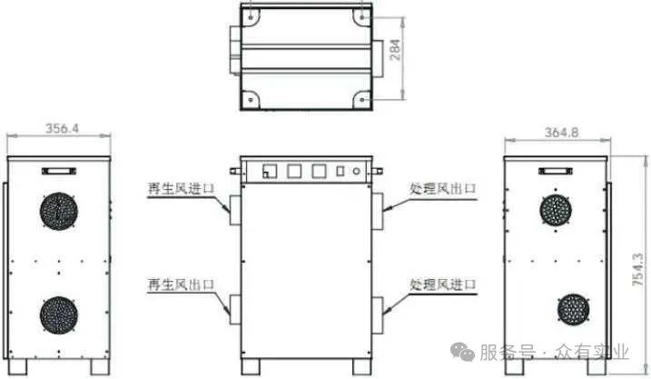 除濕機(jī)置于室外:干空氣出口和處理空氣進(jìn)口連接到除濕區(qū)域。再生風(fēng)入口和濕空氣出口不需要連接管道。