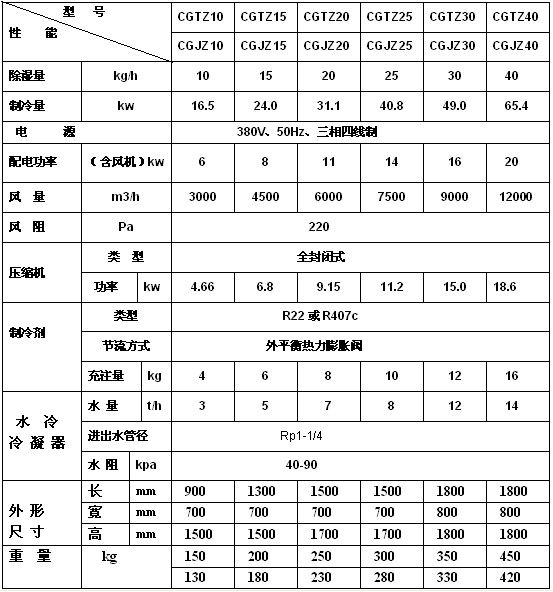 水冷調(diào)溫型管道除濕機技術(shù)指標:
